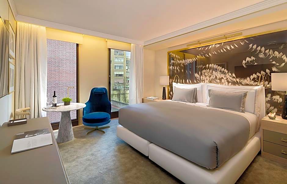 Located in the central part of the façade, the 131 ft² (430 ft2) suite overlooks the city and is flooded with natural sunlight, thanks to its large windows, which can be opened to get a real feel of the city. The bedroom and lounge area in a single space provide a way to enjoy the best views of the iconic Barcelona Eixample district. The majestic free-standing bathtub takes on the leading role in the bathroom.